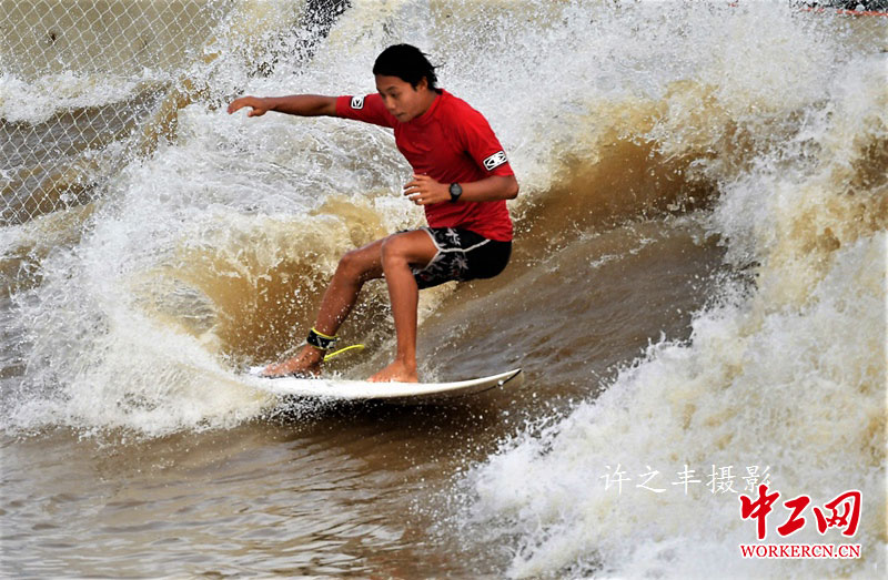 2019年8月23日,中国极限运动大会冲浪比赛在河南濮阳清丰极限运动基地进行。冲浪是以海浪为动力的极限运动,冲浪是相当惊险刺激的运动,运动员都要有很高的技巧和平衡能力,脚踏冲浪板,出没在惊涛骇浪之中。本次中国极限运动大会冲浪比赛是在水池中人工机械造浪中运动员进行冲浪比赛。工人日报-中工网许之丰摄影报道