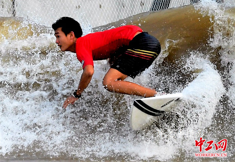2019年8月23日,中国极限运动大会冲浪比赛在河南濮阳清丰极限运动基地进行。冲浪是以海浪为动力的极限运动,冲浪是相当惊险刺激的运动,运动员都要有很高的技巧和平衡能力,脚踏冲浪板,出没在惊涛骇浪之中。本次中国极限运动大会冲浪比赛是在水池中人工机械造浪中运动员进行冲浪比赛。工人日报-中工网许之丰摄影报道