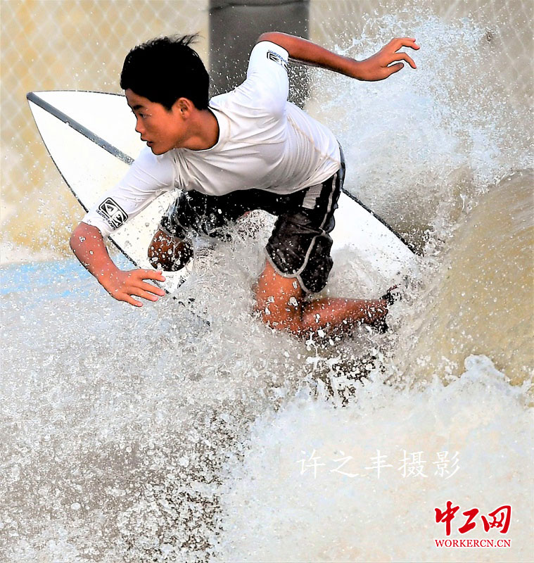 2019年8月23日,中国极限运动大会冲浪比赛在河南濮阳清丰极限运动基地进行。冲浪是以海浪为动力的极限运动,冲浪是相当惊险刺激的运动,运动员都要有很高的技巧和平衡能力,脚踏冲浪板,出没在惊涛骇浪之中。本次中国极限运动大会冲浪比赛是在水池中人工机械造浪中运动员进行冲浪比赛。工人日报-中工网许之丰摄影报道