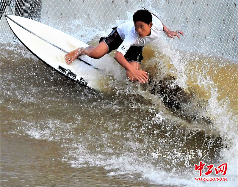 2019年8月23日,中国极限运动大会冲浪比赛在河南濮阳清丰极限运动基地进行。冲浪是以海浪为动力的极限运动,冲浪是相当惊险刺激的运动,运动员都要有很高的技巧和平衡能力,脚踏冲浪板,出没在惊涛骇浪之中。本次中国极限运动大会冲浪比赛是在水池中人工机械造浪中运动员进行冲浪比赛。工人日报-中工网许之丰摄影报道
