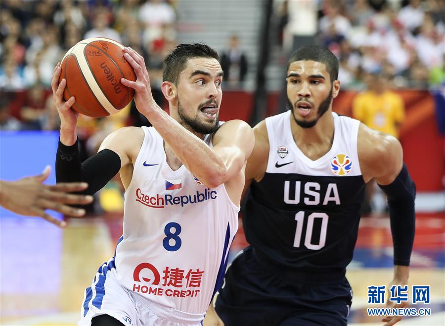 9月1日,捷克队球员萨托兰斯基(左)在比赛中突破美国队球员塔图姆的防守上篮。 当日,在上海举行的2019年国际篮联篮球世界杯小组赛E组比赛中,美国队以88比67战胜捷克队。 新华社记者丁汀摄