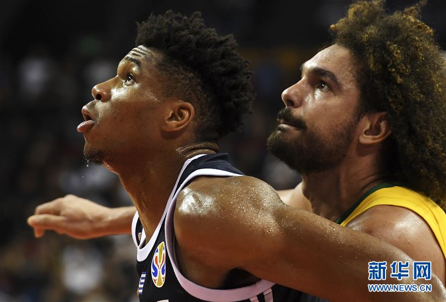 9月3日,希腊队球员扬·安特托昆博(左)与巴西队球员瓦莱乔在比赛中拼抢。 当日,在南京举行的2019年国际篮联篮球世界杯小组赛F组比赛中,巴西队以79比78战胜希腊队。 新华社记者韩瑜庆摄