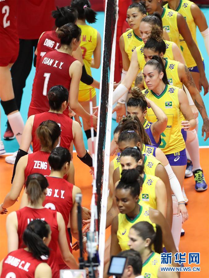 9月22日,中国队球员(左)在比赛后与巴西队球员握手致意。新华社记者杜潇逸摄