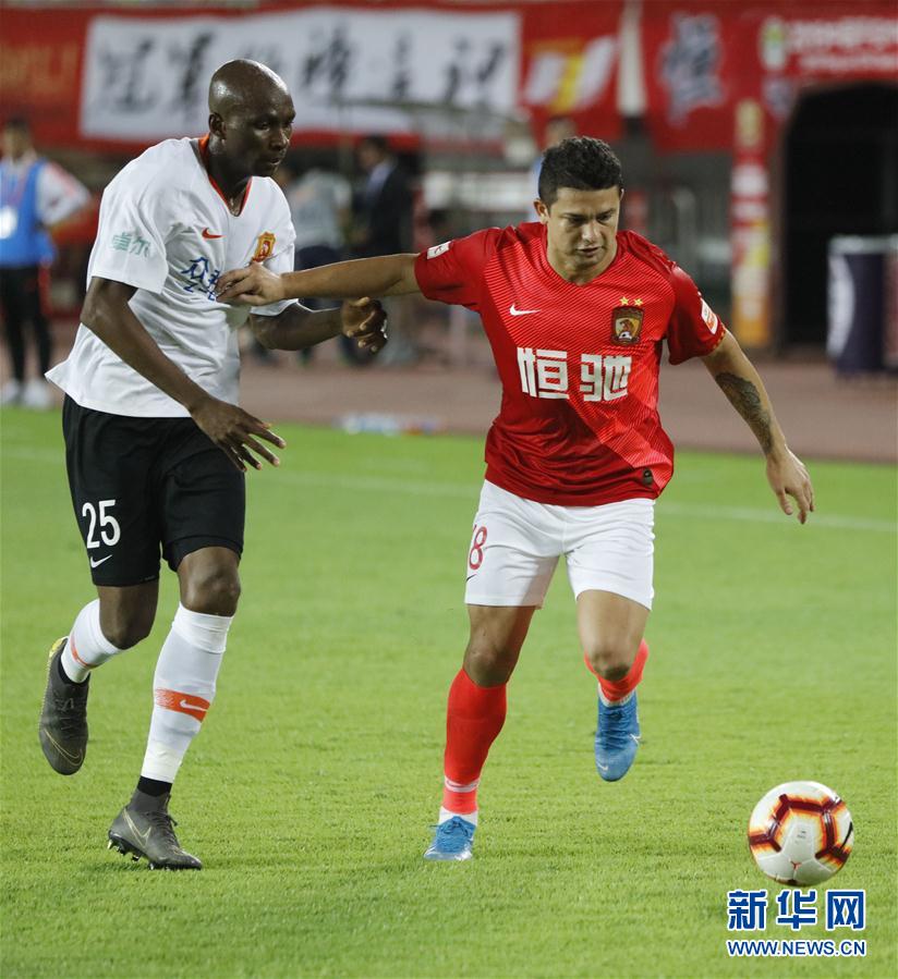 9月22日,广州恒大淘宝队球员艾克森(右)在比赛中突破武汉卓尔队球员姆比亚的防守。 当日,在广州举行的2019赛季中超联赛第25轮比赛中,广州恒大淘宝队主场以0比1不敌武汉卓尔队。 新华社记者黄国保摄