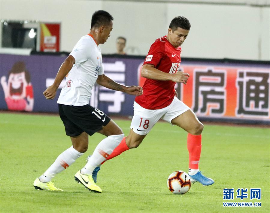 9月22日,广州恒大淘宝队球员艾克森(右)在比赛中突破武汉卓尔队球员宋志伟的防守。 当日,在广州举行的2019赛季中超联赛第25轮比赛中,广州恒大淘宝队主场以0比1不敌武汉卓尔队。 新华社记者黄国保摄