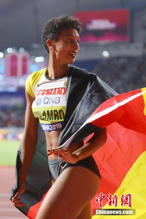 当地时间10月6日,在卡塔尔多哈举行的2019国际田联世界田径锦标赛女子跳远决赛中,德国选手米哈姆博(Mihambo)以7米30的成绩夺冠,乌克兰选手别赫-罗曼丘克(Bekh-Romanchuk)以6米92的成绩获得亚军,尼日利亚选手布鲁梅(Brume)以6米91的成绩获得季军。图为米哈姆博在夺冠后庆祝。 中新社记者 泱波 摄