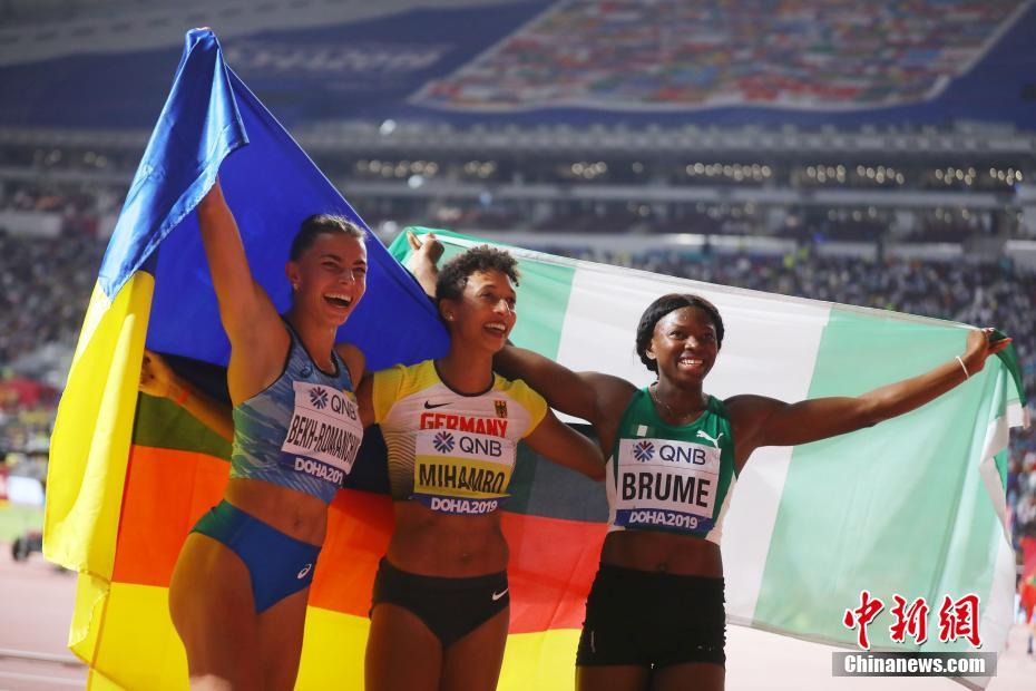 当地时间10月6日,在卡塔尔多哈举行的2019国际田联世界田径锦标赛女子跳远决赛中,德国选手米哈姆博(Mihambo)以7米30的成绩夺冠,乌克兰选手别赫-罗曼丘克(Bekh-Romanchuk)以6米92的成绩获得亚军,尼日利亚选手布鲁梅(Brume)以6米91的成绩获得季军。图为米哈姆博(中)、别赫-罗曼丘克(左)和布鲁梅在赛后合影。 中新社记者 泱波 摄