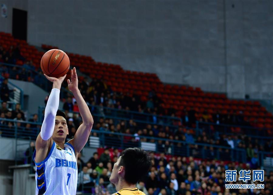 10月10日,北京首钢队球员林书豪(左一)在比赛中投篮。 当日,在青海西宁举行的2019-2020赛季CBA季前赛中,北京首钢队以91比94不敌浙江广厦。 新华社记者张龙摄