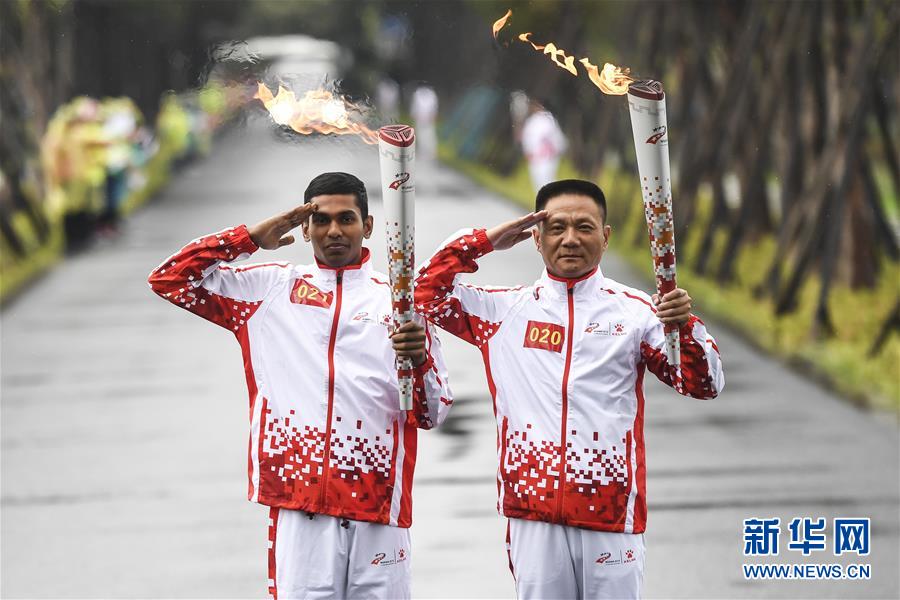 10月16日,第20名火炬手刘五桥(右)与第21名火炬手肯查拉在传递火炬。 当日,第七届世界军人运动会火炬传递活动在武汉东湖绿道举行。 新华社发(尹棣摄)