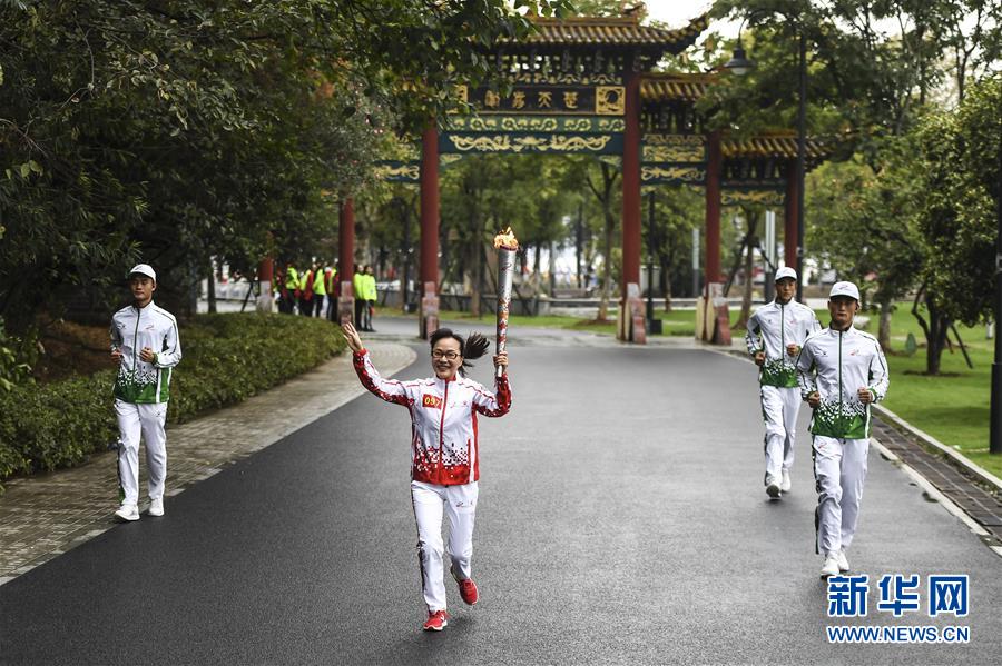 10月16日,第97名火炬手胡爱娣在传递火炬。 当日,第七届世界军人运动会火炬传递活动在武汉东湖绿道举行。 新华社发(尹棣摄)
