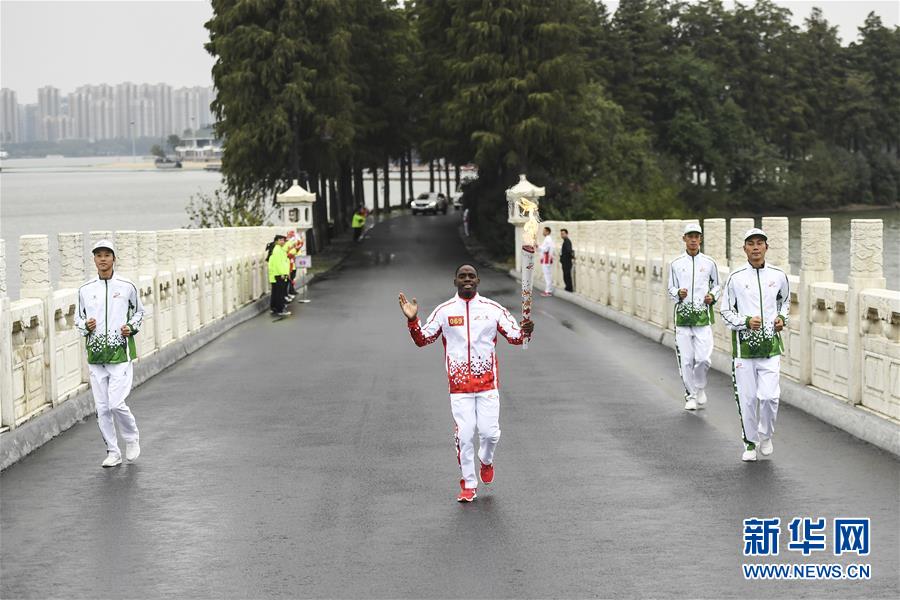 10月16日,第69名火炬手哈维尔在传递火炬。 当日,第七届世界军人运动会火炬传递活动在武汉东湖绿道举行。 新华社发(尹棣摄)