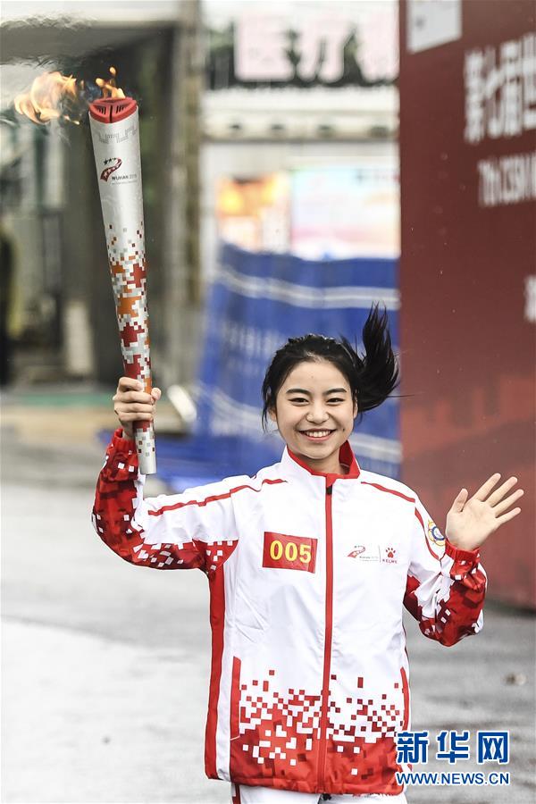 10月16日,第五名火炬手刘蕙瑕在传递火炬。 当日,第七届世界军人运动会火炬传递活动在武汉东湖绿道举行。 新华社发(尹棣摄)