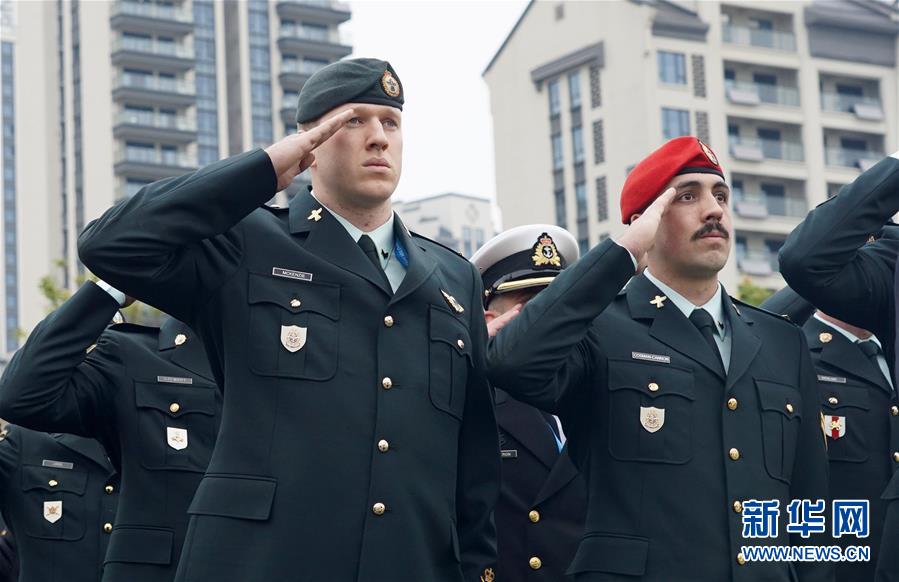 10月16日,加拿大代表团成员在军运村升旗仪式现场。 当日,入住军运会运动员村的部分代表团举行升旗仪式。第七届世界军人运动会将于10月18日开幕。 新华社记者 万象 摄