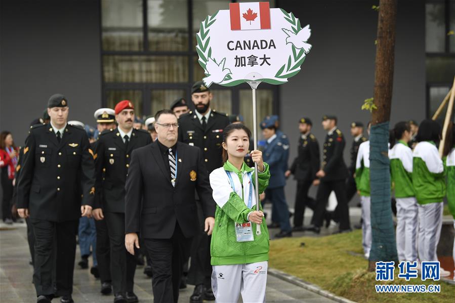 10月16日,加拿大代表团成员来到军运村升旗仪式现场。 当日,入住军运会运动员村的部分代表团举行升旗仪式。第七届世界军人运动会将于10月18日开幕。 新华社记者 王鹏 摄