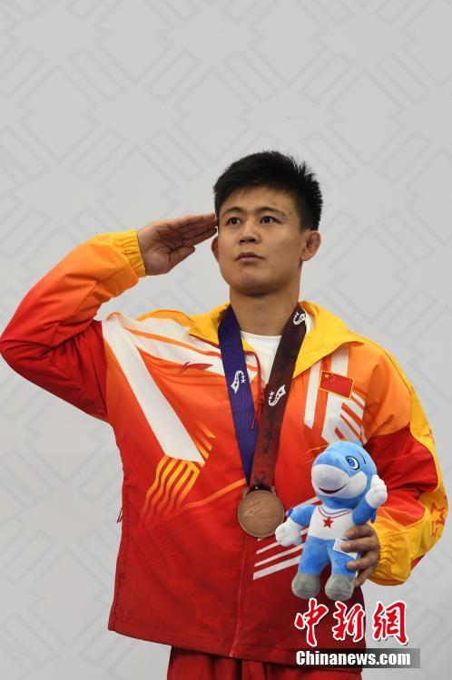 10月21日,第七届世界军人运动会摔跤比赛在湖北武汉软件工程职业学院体育馆开赛。在男子自由式摔跤65公斤级争夺中,中国选手田争光通过复活赛夺得铜牌。这也是中国八一摔跤队的首块奖牌。图为颁奖仪式现场。中新社记者 周毅 摄