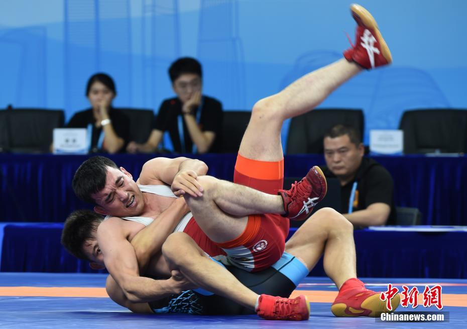 10月21日,第七届世界军人运动会摔跤比赛在湖北武汉软件工程职业学院体育馆开赛。在男子自由式摔跤65公斤级争夺中,中国选手田争光通过复活赛夺得铜牌。这也是中国八一摔跤队的首块奖牌。图为中国选手田争光与土耳其选手HEMRAYEV Gerchek在场上较量。中新社记者 周毅 摄