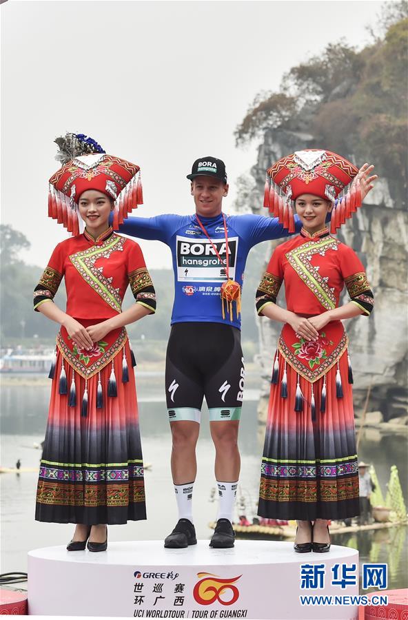 10月22日,获得象征“冲刺王”蓝色领骑衫的博拉-汉斯格雅车队车手帕斯卡·阿克曼(中)在颁奖仪式上庆祝。 当日,2019环广西公路自行车世界巡回赛在桂林市收官。 新华社记者雷嘉兴摄