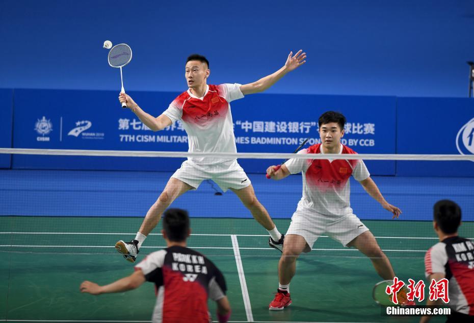 10月23日,第七届世界军人运动会羽毛球男子团体决赛在武汉市举行。中国队3-0战胜韩国,获得本届军运会羽毛球男子团体比赛金牌。图为张楠(左)和谭强在男子双打比赛中。中新社记者 安源 摄