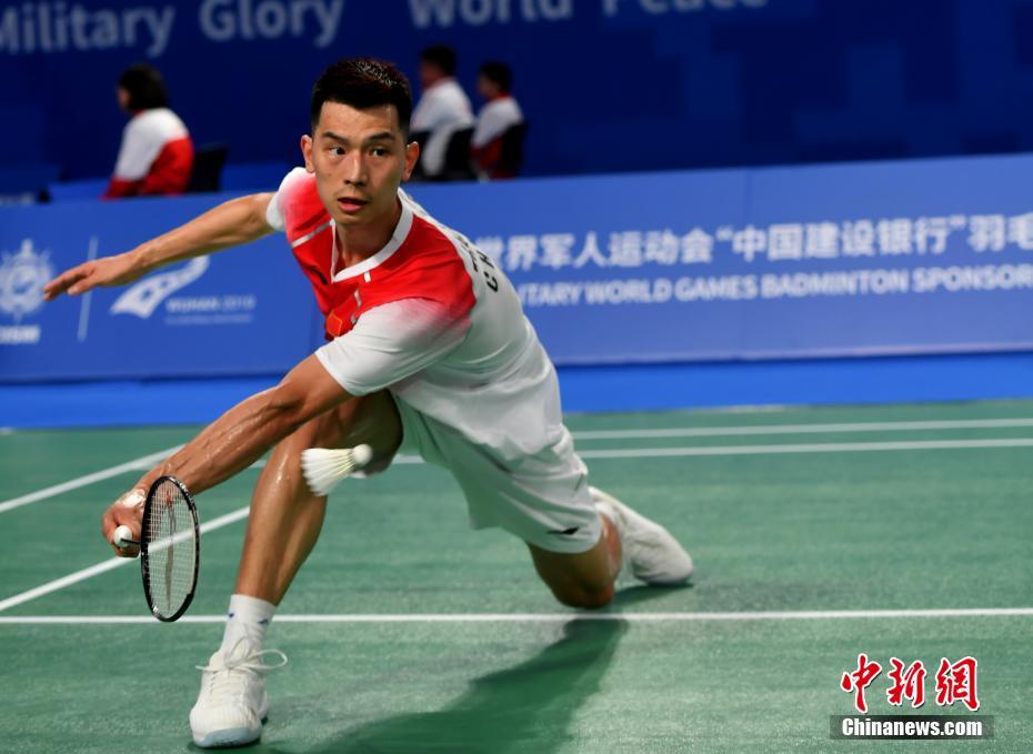 10月23日,第七届世界军人运动会羽毛球男子团体决赛在武汉市举行。中国队3-0战胜韩国,获得本届军运会羽毛球男子团体比赛金牌。图为赵俊鹏在男子单打比赛中。中新社记者 安源 摄