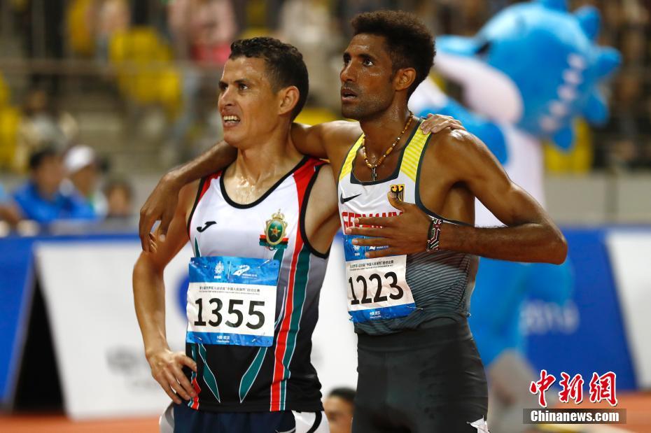 10月23日,第七届世界军人运动会田径比赛在武汉五环体育中心举行。在男子一万米决赛中,来自摩洛哥的选手艾拉比(1355号)以28分44秒25夺冠。图为冠军艾拉比(左)与银牌获得者德国选手彼得罗斯合影。中新社记者 富田 摄
