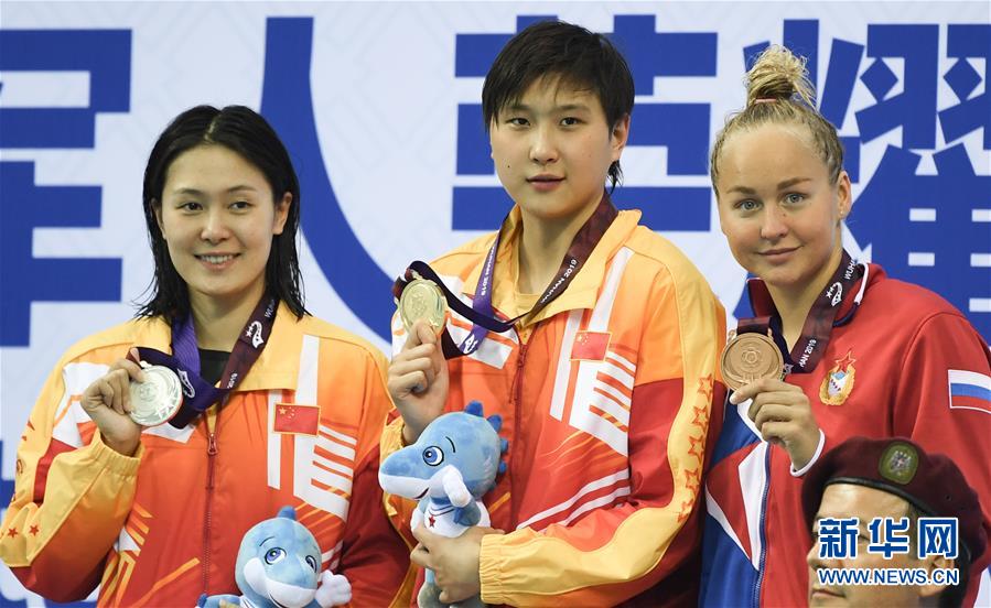 10月23日,冠军中国选手王简嘉禾(中)、亚军中国选手张雨涵(左)和季军俄罗斯选手叶戈罗娃在颁奖仪式后合影。 当日,在武汉进行的第七届世界军人运动会女子800米自由泳决赛中,中国选手王简嘉禾以8分24秒82的成绩获得冠军,中国选手张雨涵以8分31秒10的成绩获得亚军。 新华社记者程敏摄