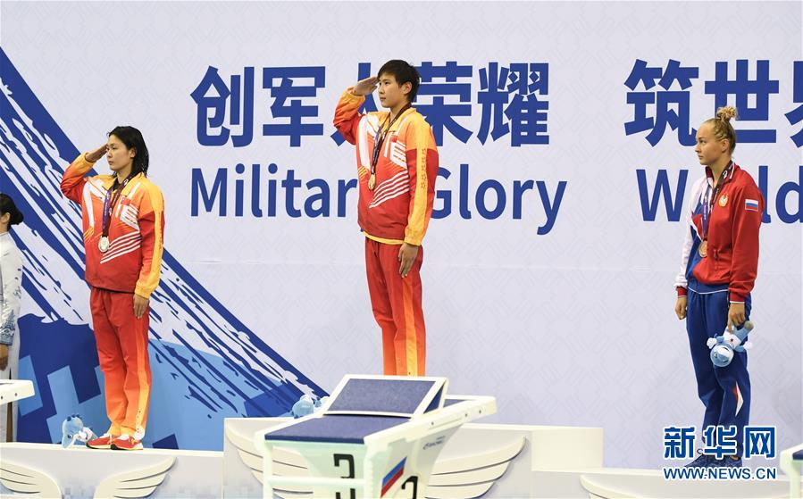 10月23日,冠军中国选手王简嘉禾(中)、亚军中国选手张雨涵(左)和季军俄罗斯选手叶戈罗娃在颁奖仪式上。 当日,在武汉进行的第七届世界军人运动会女子800米自由泳决赛中,中国选手王简嘉禾以8分24秒82的成绩获得冠军,中国选手张雨涵以8分31秒10的成绩获得亚军。 新华社记者程敏摄