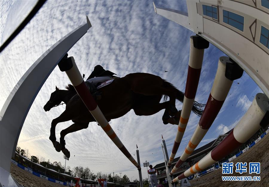 10月24日,中国选手王诗淇在马术项目比赛中。 当日,在武汉举行的第七届世界军人运动会现代五项女子团体决赛中,中国队以3901分的总成绩夺得冠军。 新华社记者 李尕 摄