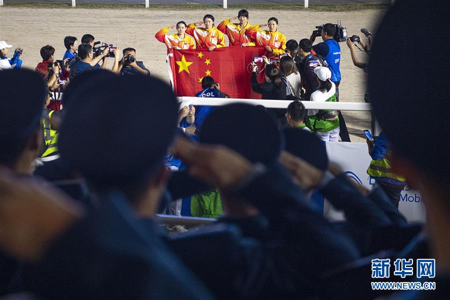 10月24日,中国队选手在获胜后向看台上的解放军拉拉队敬礼致意。 当日,在武汉举行的第七届世界军人运动会现代五项女子团体决赛中,中国队以3901分的总成绩夺得冠军。 新华社记者 熊琦 摄