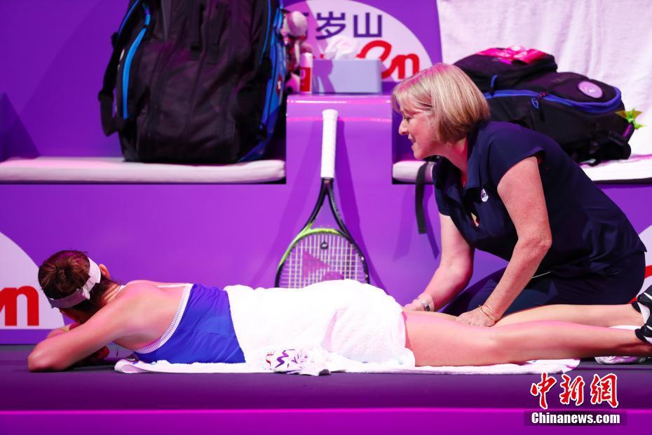 11月2日,2019深圳WTA年终总决赛在深圳湾体育中心继续进行。在一场乌克兰选手埃莉娜·斯维托丽娜与瑞士选手贝琳达·本西奇的单打半决赛争夺中,贝琳达·本西奇因伤退赛,埃莉娜·斯维托丽娜晋级决赛。图为贝琳达·本西奇在场边接受治疗。中新社记者 富田 摄