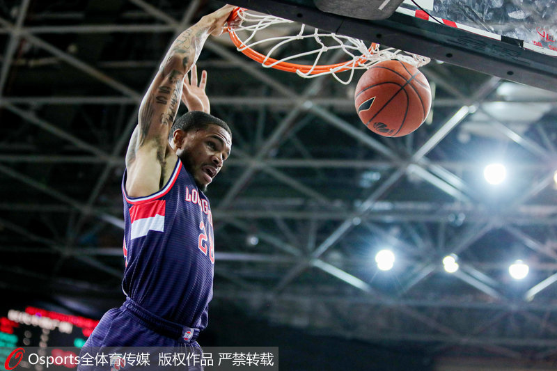 11月8日,CBA联赛第3轮,广州龙狮123:134负北京紫禁勇士,赛克斯扣篮。