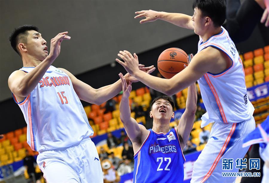 11月19日,天津先行者队球员史仪(中)在比赛中拼抢。 当日,在2019-2020赛季中国男子篮球职业联赛(CBA)常规赛第七轮比赛中,天津先行者队主场经过一个加时赛后以95比93战胜四川五粮金樽队。 新华社记者 李然 摄