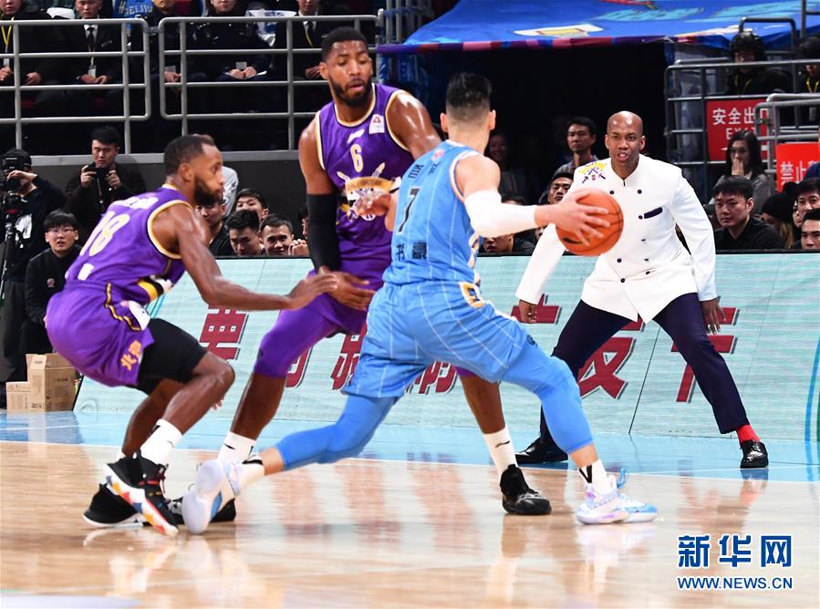 11月20日,北京控股队主教练马布里(右一)在比赛中指导球员。 当日,在2019-2020赛季中国男子篮球职业联赛(CBA)常规赛第七轮比赛中,北京首钢队主场以87比79战胜北京控股队。 新华社记者贺长山摄