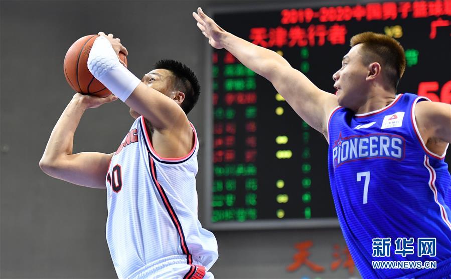 11月21日,广东东莞银行队球员赵睿(左)在比赛中投篮。 当日,在2019-2020赛季中国男子篮球职业联赛(CBA)常规赛第八轮比赛中,广东东莞银行队客场以140比93战胜天津先行者队。 新华社记者李然摄
