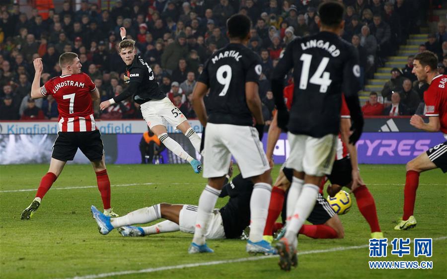 11月24日,曼联队球员威廉姆斯(左二)攻入球队第一粒进球。 当日,在2019-2020赛季英格兰足球超级联赛第13轮比赛中,曼联队客场以3比3战平谢菲尔德联队。 新华社/路透