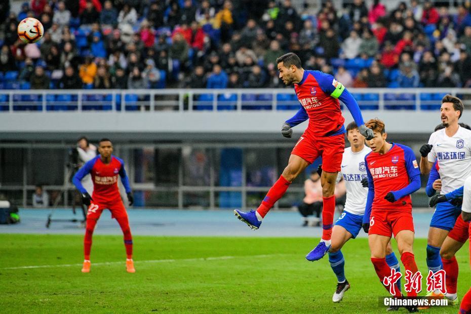 12月1日,重庆斯威队球员卡尔德克(红)在比赛中争头球。 当日,在天津奥林匹克中心体育场进行的2019赛季中国足球协会超级联赛第30轮比赛中,天津泰达队主场以2比0战胜重庆斯威队。 中新社记者 佟郁 摄