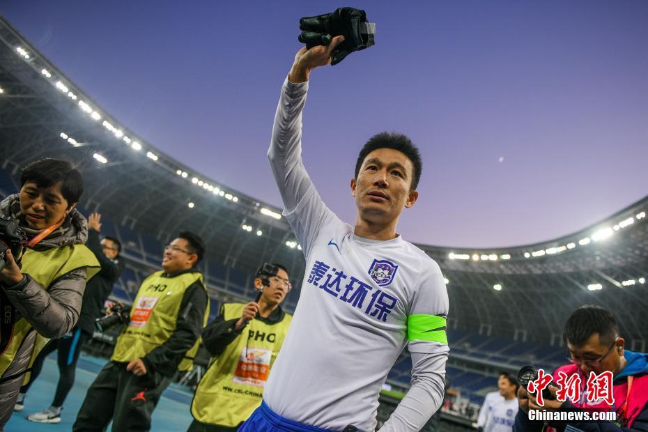 12月1日,38岁的天津泰达队球员曹阳在赛后挥手与球迷致谢,实现了一生一队的完美告别。当日,在天津奥林匹克中心体育场进行的2019赛季中国足球协会超级联赛第30轮比赛中,天津泰达队主场以2比0战胜重庆斯威队。 中新社记者 佟郁 摄