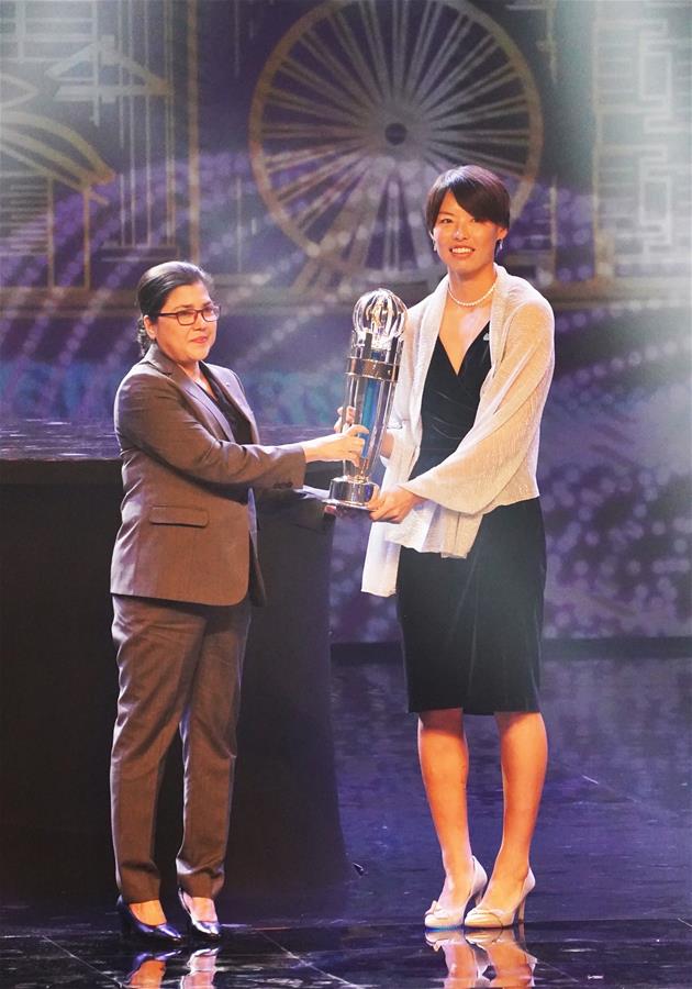 12月2日,当选亚洲足球小姐的日本球员熊谷纱希(右)在颁奖典礼上。 当日,2019亚足联年度颁奖典礼在香港举行。 新华社记者吕小炜摄