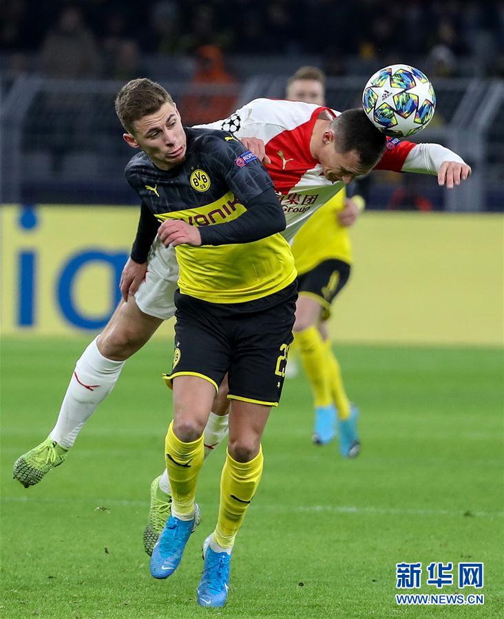 12月10日,多特蒙德队球员索尔根·阿扎尔(前)与布拉格斯拉维亚队球员博日尔在比赛中拼抢。 当日,在2019-2020赛季欧冠联赛小组赛F组比赛中,德甲多特蒙德队主场以2比1战胜捷甲布拉格斯拉维亚队,晋级十六强。 新华社发(约阿希姆·毕瓦勒兹 摄)
