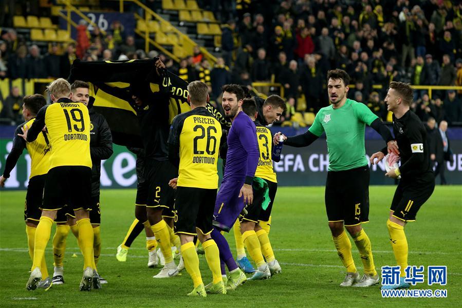 12月10日,多特蒙德队球员在比赛后庆祝胜利。 当日,在2019-2020赛季欧冠联赛小组赛F组比赛中,德甲多特蒙德队主场以2比1战胜捷甲布拉格斯拉维亚队,晋级十六强。 新华社发(约阿希姆·毕瓦勒兹 摄)