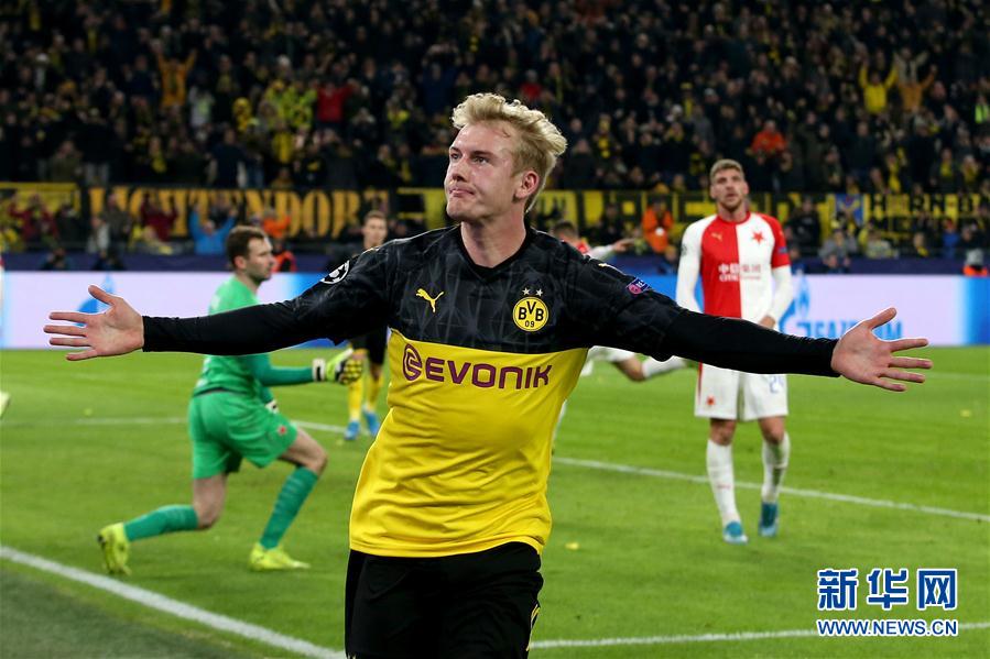 12月10日,多特蒙德队球员布兰特在比赛中庆祝进球。 当日,在2019-2020赛季欧冠联赛小组赛F组比赛中,德甲多特蒙德队主场以2比1战胜捷甲布拉格斯拉维亚队,晋级十六强。 新华社发(约阿希姆·毕瓦勒兹 摄)