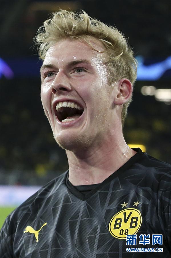 12月10日,多特蒙德队球员布兰特在比赛中庆祝进球。 当日,在2019-2020赛季欧冠联赛小组赛F组比赛中,德甲多特蒙德队主场以2比1战胜捷甲布拉格斯拉维亚队,晋级十六强。 新华社发(约阿希姆·毕瓦勒兹 摄)