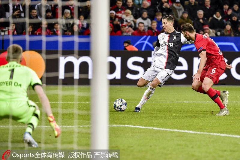 第20分钟,尤文图斯队C罗断下勒沃库森队的传球后突进到大禁区右侧,踩单车后低射球门远角偏出。