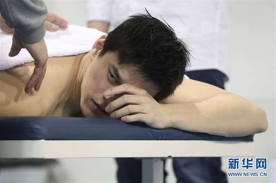12月16日,国家游泳队队员孙杨(前)在训练后接受按摩。 近期,中国国家游泳队队员在北京国家体育总局游泳馆进行训练,备战东京奥运会。 新华社记者李明摄