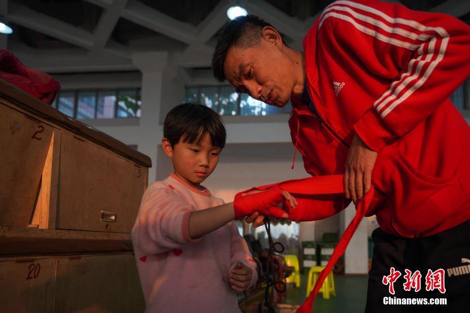 12月17日,陈跃伟(右)在训练中心帮助小学员缠绷带。今年56岁的陈跃伟,是贵州省安顺市体育训练中心一名拳击教练。从业30年来,陈跃伟培养了各级别赛事拳击冠军200余位。在陈跃伟的包里,装着一个被他视为珍宝的笔记本,记录了安顺拳击30年来取得的成绩,最近的一次记录,是陈跃伟的学生张果获得第七届世界军人运动会拳击52公斤级冠军。30年来,笔记本已记录了75页,成绩涵盖世锦赛、亚青赛、全运会、省运会等赛事。面临退休的陈跃伟谈及此生最大的愿望,坦言想为中国培养更多优秀的拳击手。 中新社记者 贺俊怡 摄