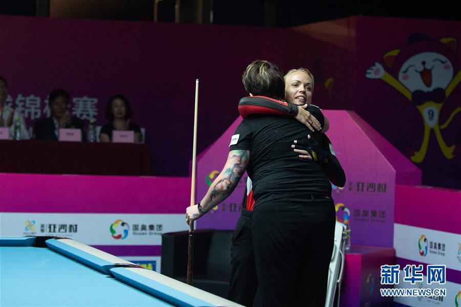 12月19日,英国选手凯莉·费雪(前)与奥地利选手贾思明·欧斯纯赛后拥抱。 当日,在2019海南三亚世界女子9球锦标赛决赛中,英国选手凯莉·费雪以9比7战胜奥地利选手贾思明·欧斯纯,夺得冠军。 新华社发(张丽芸摄)