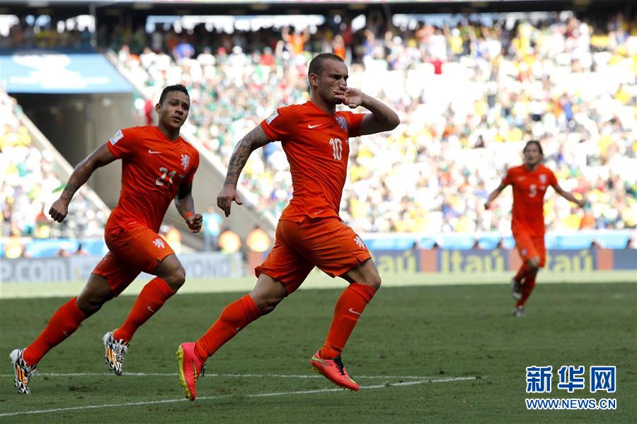 图为2014年6月29日,在与墨西哥队的2014年巴西世界杯八分之一决赛中,荷兰队球员斯内德(中)在破门得分后庆祝。 新华社记者周磊摄