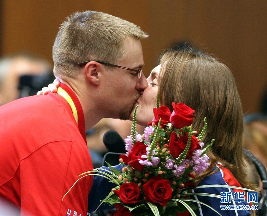 图为2008年8月9日,埃蒙斯(左)在北京奥运会上祝贺获得女子10米气步枪金牌的妻子卡捷琳娜。 新华社记者姚大伟摄