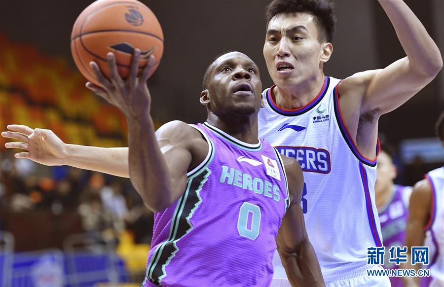 12月24日,天津先行者队球员时德帅(右)在比赛中防守山东西王队球员哈德森。 当日,在2019-2020赛季中国男子篮球职业联赛(CBA)常规赛第21轮比赛中,山东西王队客场以132比115战胜天津先行者队。 新华社记者李然摄