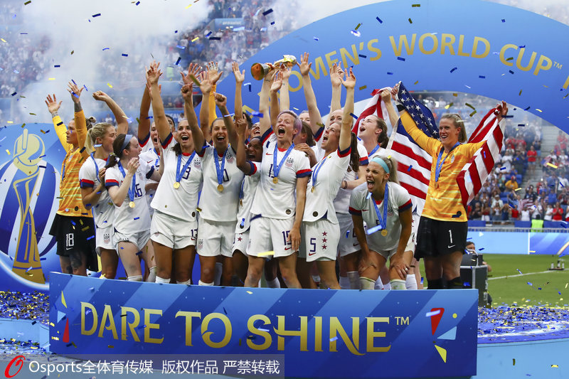 7月7日,法国女足世界杯决赛,美国2:0荷兰。美国队庆祝夺冠。