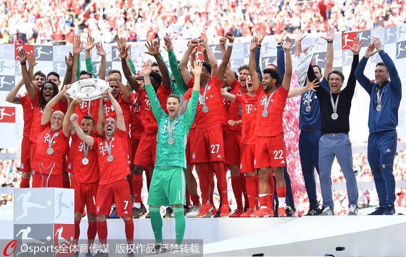 5月18日,2018-19赛季德甲联赛第34轮,拜仁慕尼黑5:1法兰克福。拜仁豪取7连冠。